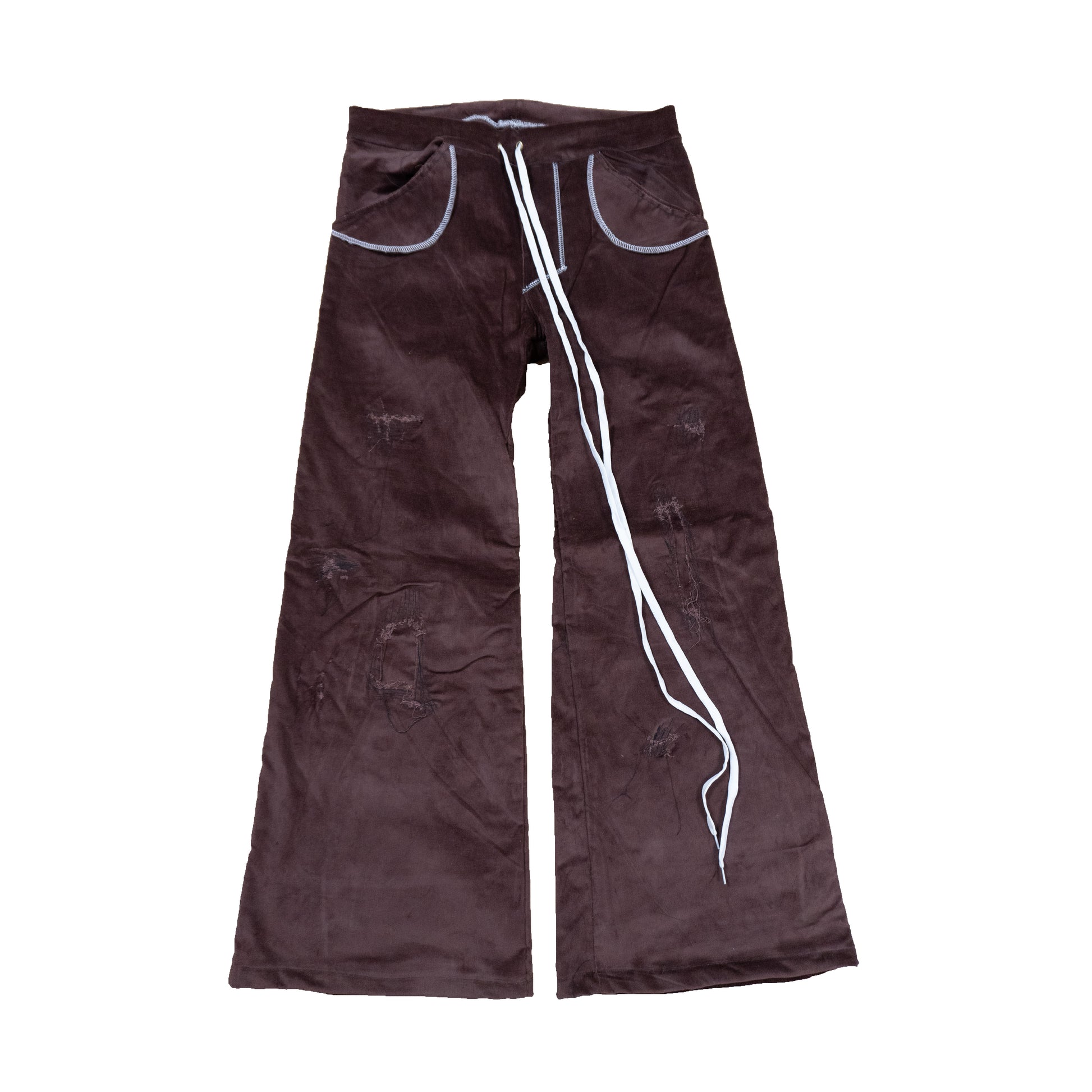 Smooth, rich brown velour is slashed and stitched with visible repair marks, giving the pants a lived-in story. Oversized curved pockets are accented with bright contrast stitching, while extra-long white drawstrings cascade down the front for an adjustable and exaggerated detail that balances the fitted waist with the wide-leg shape. -