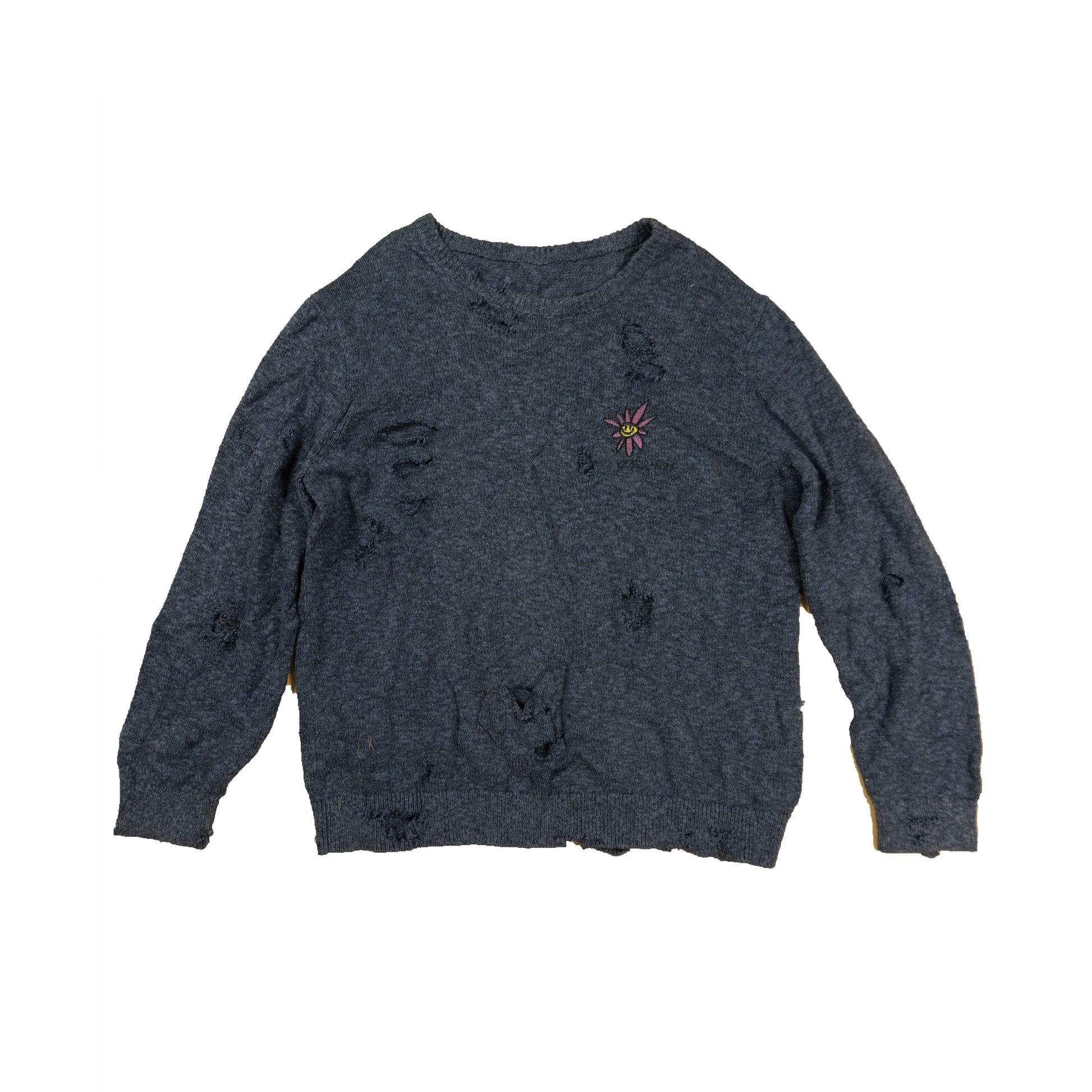 The Wilted Smiles Sweater is soft destruction — cozy yet chaotic. This charcoal knit pullover features intentional distressing throughout and a small embroidered flower patch that feels both hopeful and haunted.